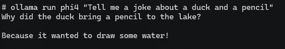 ollama run phi4 "Tell me a joke about a duck and a pencil"