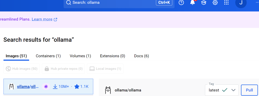 You can pull the ollama image in a powershell prompt from docker hub with this command: